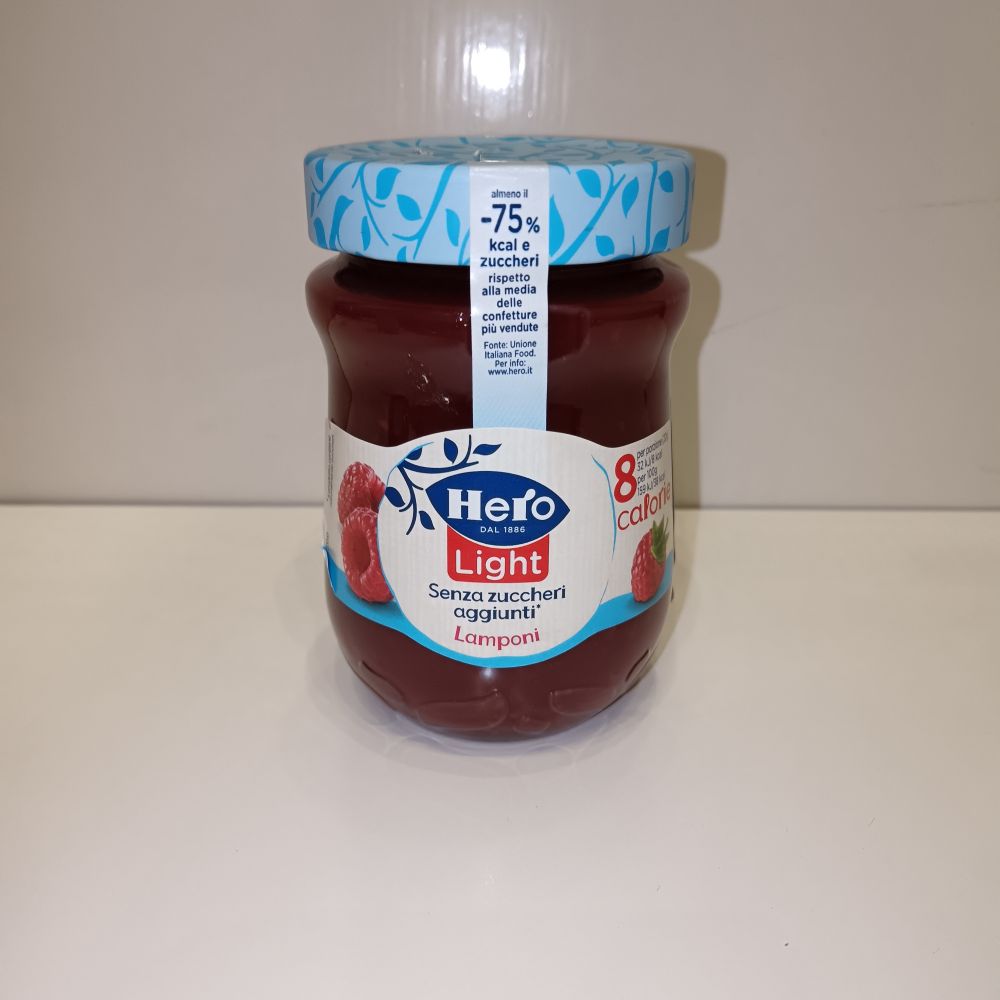 Málna lekvár cukor nélkül Összetevők: málna, víz, édesítőszerek: szorbit szirup, szteviol glikozidok, szukralóz, aceszulfám K, citromlé koncentrátum, zselésítőszer: pektin, tartósítószer (kálium-szorbát), stabilizátor (kálcium-klorid). Gyümölcstartalom: 50g/100g Átlagos tápérték/100g: Energia:159kJ/ 38 kcal Zsír:0,1g telített zsírsavak:0g Szénhidrát:11,5g ebből cukrok:3g, ebből poliol:8,5g, Fehérje:0,4g, Rost:1,5g, Só:0g Minőségét megőrzi (nap/hó/év): Lásd a csomagoláson. Tárolása: Száraz hűvös helyen. Felbontás után hűtve tárolja, néhány napon belül fogyassza el. Nettó mennyiség:280g Származási hely: Olaszország Gyártja: Hero Italia Spa, 37121 Verona